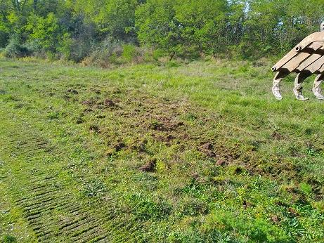 2.55 ha de prairies et pelouses ont ainsi fait l’objet d’actions d’arrachage mécanique des éléments arbustifs et évacuation en lisière après broyage. Les arbres de hauts jets présents sur site ont été maintenus. La terre a été re-compactée après chaque arrachage et la zone travaillée a finalement subi un griffage superficiel visant le rajeunissement des successions végétales.